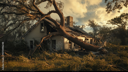 Zniszczone drzewo leży na dachu domu, wskazując na skutki huraganu i intensywności sił natury.