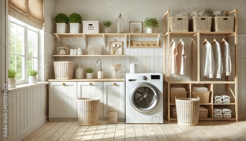 さわやかで明るいスカンジナビア風ランドリールーム ドラム式洗濯機 サンルーム