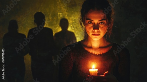 A young woman holds a candle in a dark room, with the silhouettes of three people behind her.