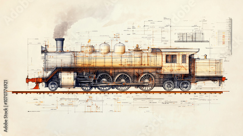 Vintage Steam Engine on Blueprint: A detailed watercolor illustration of a classic steam locomotive against a vintage blueprint background.