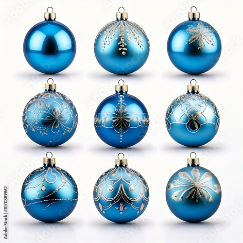 Zestaw błękitnych, ozdobnych bombek na białym tle