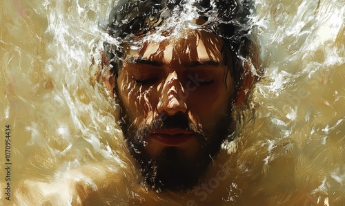 An artistic depiction of Jesus being baptized, showing a peaceful expression as water flows over him, symbolizing spiritual renewal