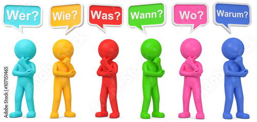 Wissensbegierige, nachdenkliche bunte 3d Männchen mit Sprechblasen..Große Diskussionsrunde mit vielen W-Fragen.