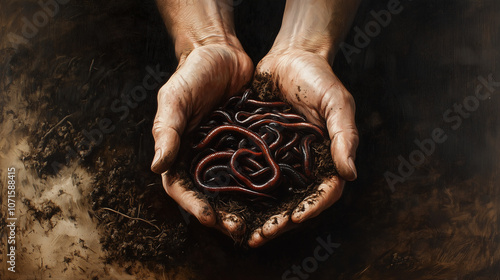 Ręce delikatnie trzymają grupę żywych dżdżownic w glebie pełnej składników odżywczych