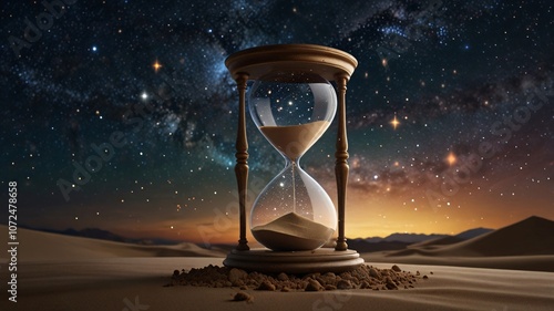 An hourglass resting on desert sands under a starry night sky at dusk, symbolizing the passage of time and stillness in nature