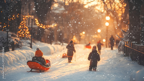 Kids playing in the snow during a Christmas family outing with sleds.