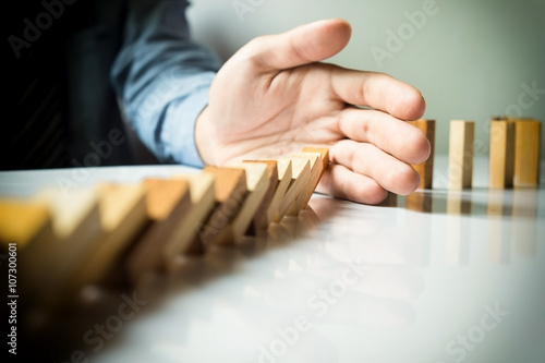 businessman hand stop dominoes continuous toppled or risk with c