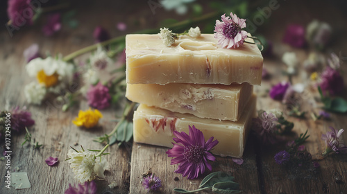 Naturalne, ręcznie robione mydła ozdobione świeżymi kwiatami i ziołami, leżące na rustykalnym drewnie.
