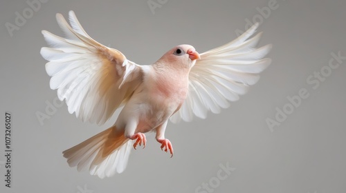 An elegant white bird with outstretched wings gliding gracefully, set against a soft neutral background, exuding peace and purity through its delicate features.