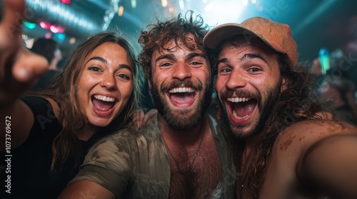 Three happy friends captured in a vibrant moment at a party, showcasing the joy and unity among them as they enjoy their time in a festive atmosphere together.