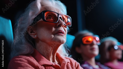 An elderly woman, wearing 3D glasses, watches a movie with awe and fascination, embodying the magic and immersive power of modern cinematic experiences.