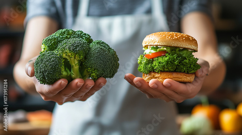 Osoba porównuje brokuły i burgera pod kątem wartości odżywczych, podkreślając codzienny wybór pomiędzy zdrowymi a mniej zdrowymi posiłkami.