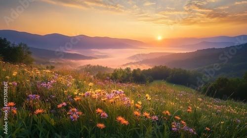A stunning sunrise over the Blue Ridge Mountains, showcasing vibrant wildflowers and misty valleys in early morning light