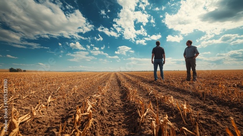 Two Men Standing in a Harvested Field with a Blue Sky and Clouds