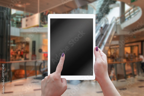 Tablet with blank screen in woman hands. Shopping time in mall.