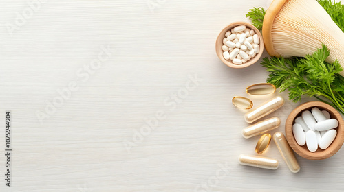 overhead flat lay view of lions mane mushroom with vitamin supplement tablets