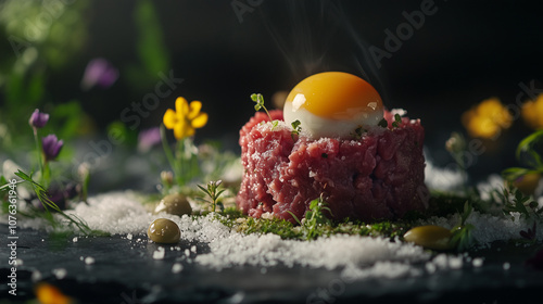Tatarski przysmak z delikatnej wołowiny, ozdobiony złocistym żółtkiem jajka przepiórczego.