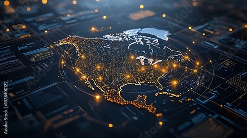 Futuristic high tech digital map of North America showcasing a complex network grid with glowing golden nodes interconnected patterns and lights of varying brightness representing the concept of data