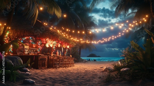Close up of the glowing light bulbs at the beach cafe terrace. Sun is setting