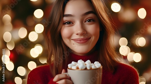 kobieta europejska, brązowe włosy, świąteczny portret, czerwona sweter, świąteczna atmosfera, kubek gorącej czekolady, rozświetlone tło, świąteczne kolory, uśmiech, świąteczne lampki, twinkling lights