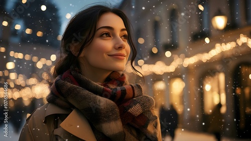 świąteczny portret, kobieta europejska, ciemne włosy, niski kucyk, klasyczny styl, beżowy płaszcz, świąteczny nastrój, uśmiech, świąteczne kolory, urok europejskiej architektury, świąteczne światło, b