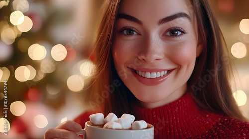 kobieta europejska, brązowe włosy, świąteczny portret, czerwona sweter, świąteczna atmosfera, kubek gorącej czekolady, rozświetlone tło, świąteczne kolory, uśmiech, świąteczne lampki, twinkling lights