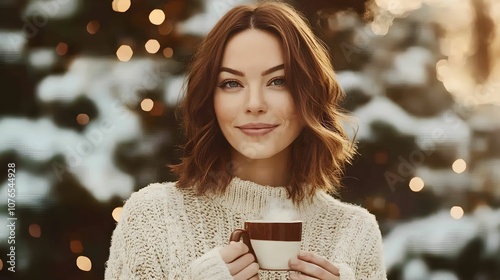 świąteczny portret, kobieta europejska, brązowe włosy, kremowy sweter, kubek gorącej herbaty, świąteczna atmosfera, delikatny makijaż, uśmiech, ciepły nastrój, świąteczne tło, choinka, śnieżne tło, św