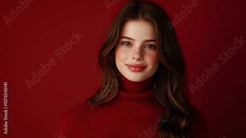 świąteczny portret, młoda kobieta, ciemne brązowe włosy, czerwony golf, świąteczny nastrój, czerwone tło, świąteczna elegancja, subtelny uśmiech, minimalistyczny styl, portret z bliska, świąteczny kli