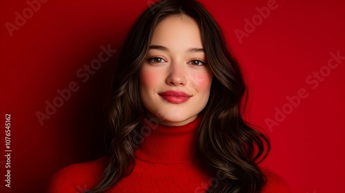 świąteczny portret, młoda kobieta, ciemne brązowe włosy, czerwony golf, świąteczny nastrój, czerwone tło, świąteczna elegancja, subtelny uśmiech, minimalistyczny styl, portret z bliska, świąteczny kli