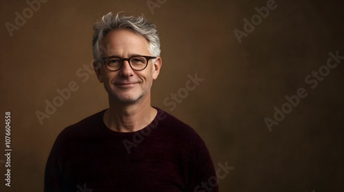 świąteczny portret, dojrzały mężczyzna, siwe włosy, okulary, bordowy sweter, minimalistyczne tło, brązowe tło, świąteczna elegancja, ciepły uśmiech, klasyczna uroda, europejska elegancja, subtelne kol
