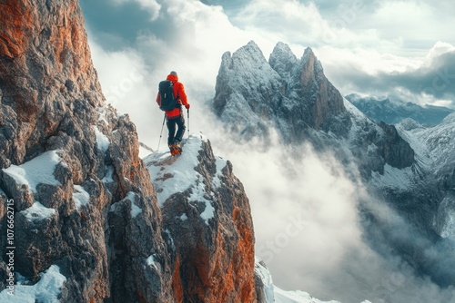 Adventurer hiking on a mountain ridge in snowy landscape during daytime with dramatic clouds
