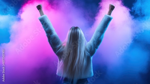 A person stands with arms lifted in triumph, surrounded by a dynamic swirl of colorful smoke. The atmosphere exudes energy and excitement, typical of a festive event