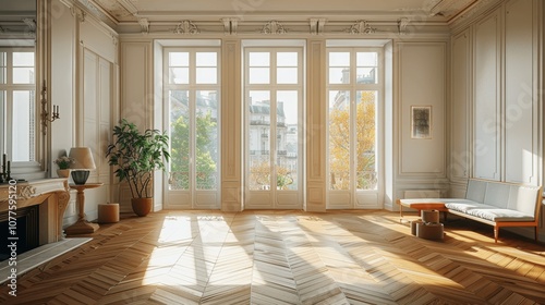 Vintage Parisian Apartment with White Walls, Parquet Floor, and Large Windows