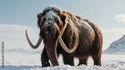 A woolly mammoth walks through a snowy landscape under a clear blue sky in a serene winter environment
