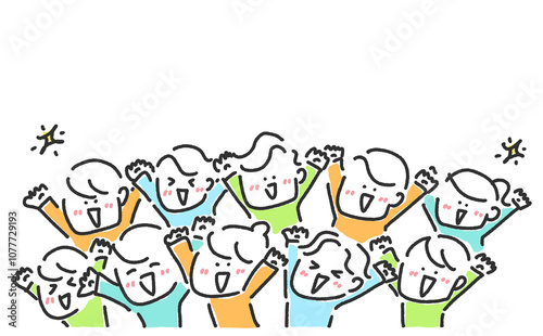 手を上げて笑顔で喜ぶたくさんの人々・応援・万歳・ファン