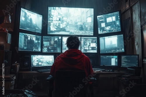 hacker seated in front of multiple computer screens immersed in committing digital cybercrime captured in a dark moody atmosphere filled with technological intrigue
