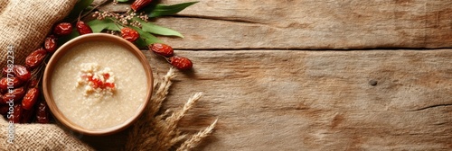 Rustic flat lay of laba festival essentials with porridge and red dates on wooden table