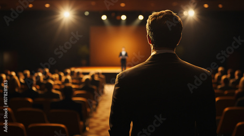 A professional speaker addressing an audience from the stage, with bright lights focused on the speaker, highlighting the atmosphere of a formal event.