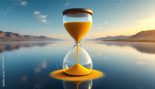 massive hourglass with yellow sand against serene lake backdrop, symbolizing passage of time and tranquility