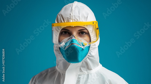 Chemiczny specjalista w odzieży ochronnej, w tym masce, goglach i zabezpieczającym kombinezonie, który podkreśla gotowość na niebezpieczne sytuacje.
