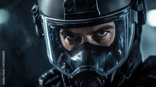 Chemiczny specjalista w odzieży ochronnej, w tym masce, goglach i zabezpieczającym kombinezonie, który podkreśla gotowość na niebezpieczne sytuacje.