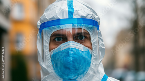 Chemiczny specjalista w odzieży ochronnej, w tym masce, goglach i zabezpieczającym kombinezonie, który podkreśla gotowość na niebezpieczne sytuacje.