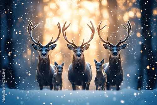 Group of deer standing in a snowy forest, illuminated by a warm, glowing sunset in the background.