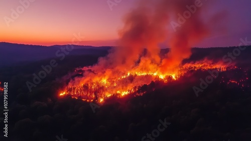 Aerial view of a forest fire at sunset, showcasing flames and smoke in a natural landscape.