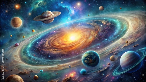 A cosmic ballet of celestial bodies, swirling around a vibrant nebula in a symphony of colors and light.