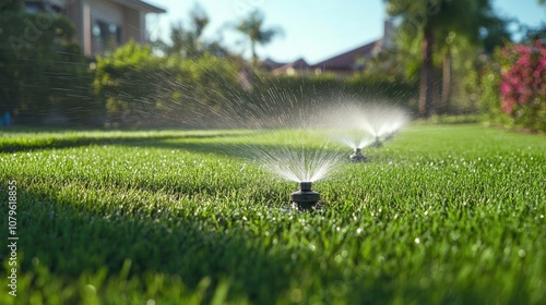 Advanced sprinkler system irrigating a lush green lawn with multiple units in operation
