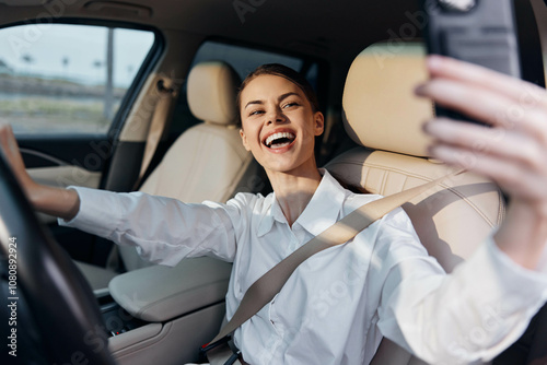 A woman is driving a car and taking a selfie with her cell phone while sitting in the driver's seat