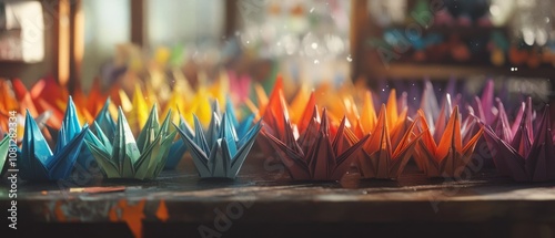 A vibrant array of origami lotus flowers in diverse hues is spread across a table, each reflecting creative finesse and handmade beauty.