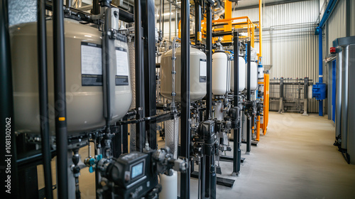Zaawansowane systemy filtracyjne w zakładzie uzdatniania wody, z widoczną separacją czystej i brudnej wody.