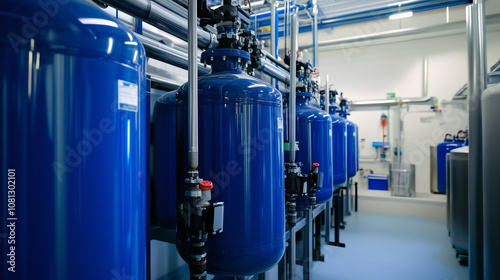 Zaawansowane systemy filtracyjne w zakładzie uzdatniania wody, z widoczną separacją czystej i brudnej wody.
